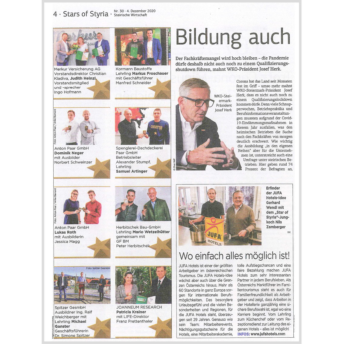 Die Wirtschaftskammer Steiermark und die Kleine Zeitung bringen im November und Dezember einen Schwerpunkt zur Ehrung der Top Fachkräfte und deren Ausbildungsbetriebe heraus, die STARS OF STYRIA Sonderbeilagen 2020.