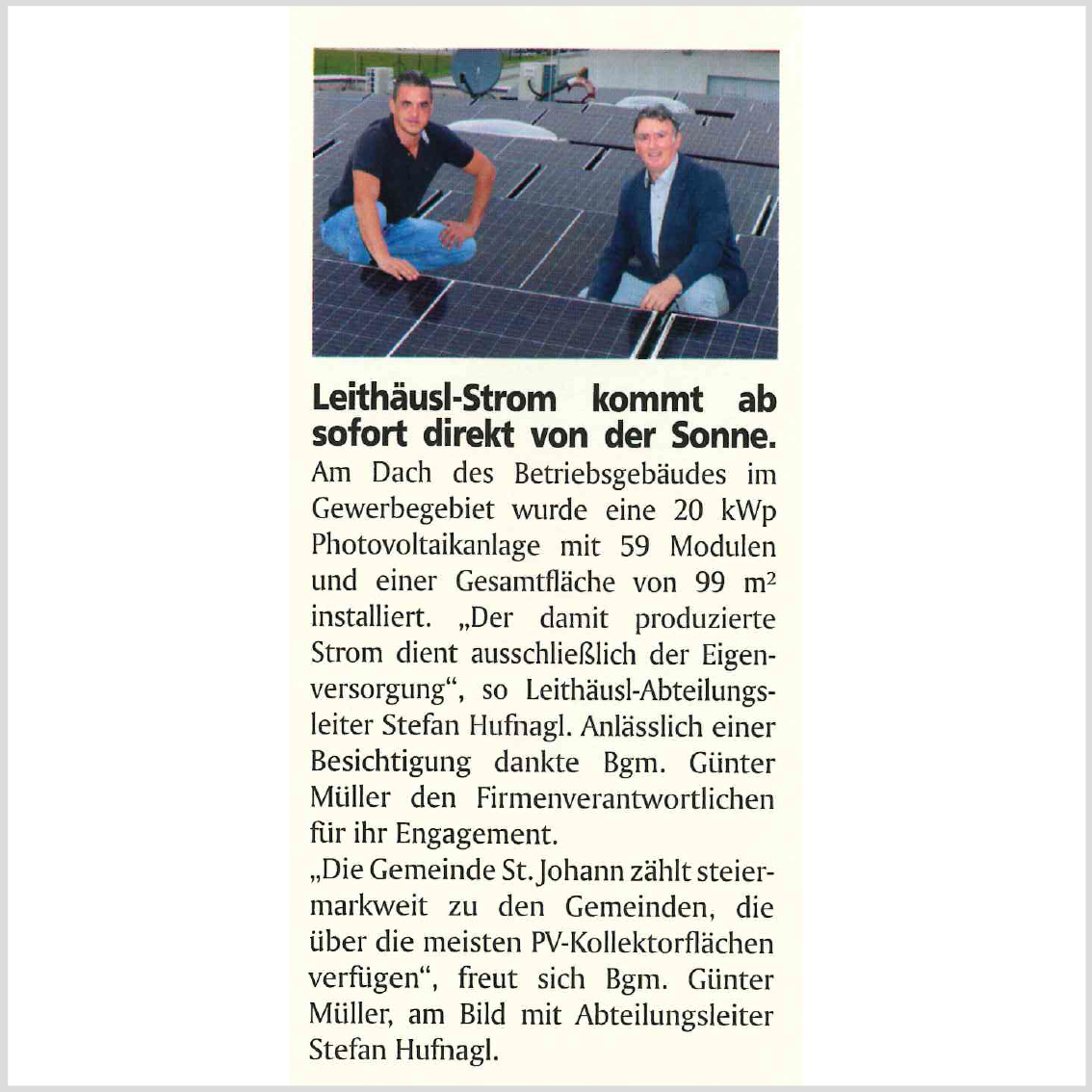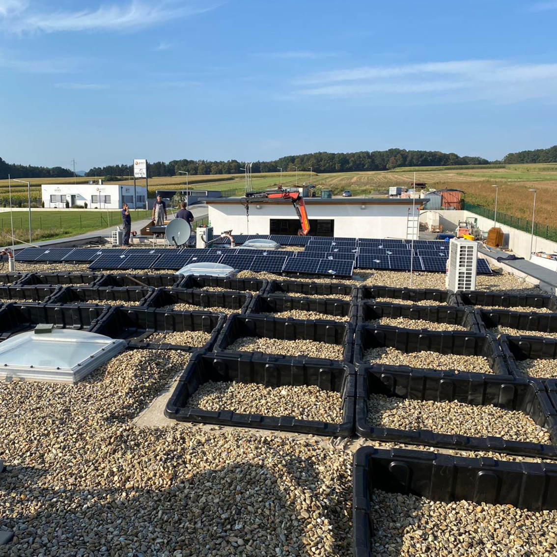Seit 01.11.2020 ist unsere neue Photovoltaikanlage mit einer Leistung von 20kWp, bestehend aus 59 Modulen und einer Gesamtfläche von 99 m², in Betrieb. Sie befindet sich auf dem Dach unseres Büros am Standort Hartberg in der Steiermark und ist somit die zweite Photovoltaikanlage innerhalb der Firmengruppe. Diese Anlage soll auch hier der Eigenstromerzeugung aus Sonnenenergie für das Bürogebäude dienen. Wieviel kWh an Strom wir mithilfe dieser Anlage bereits erzeugen konnten, werden wir euch demnächst berichten.