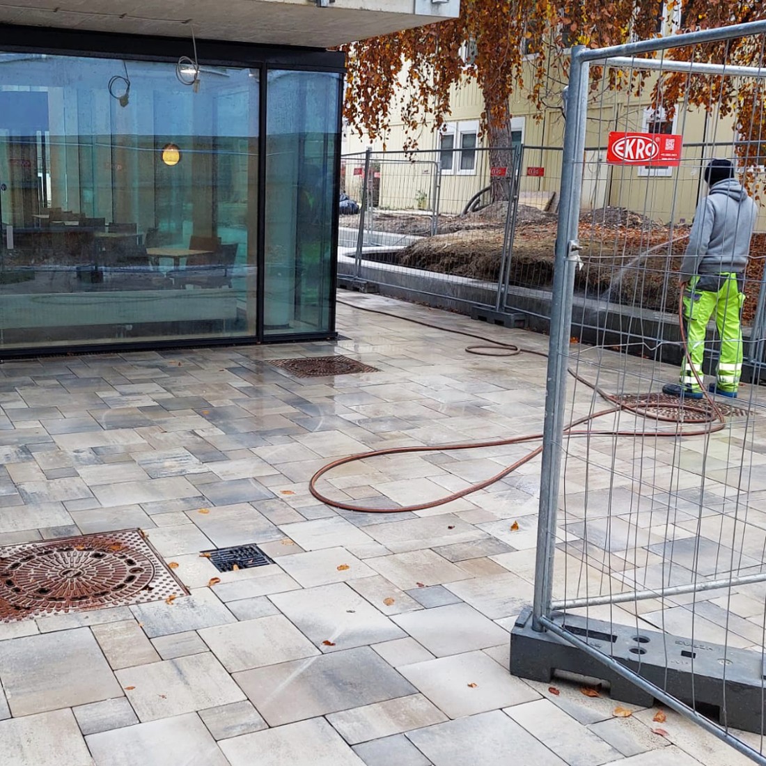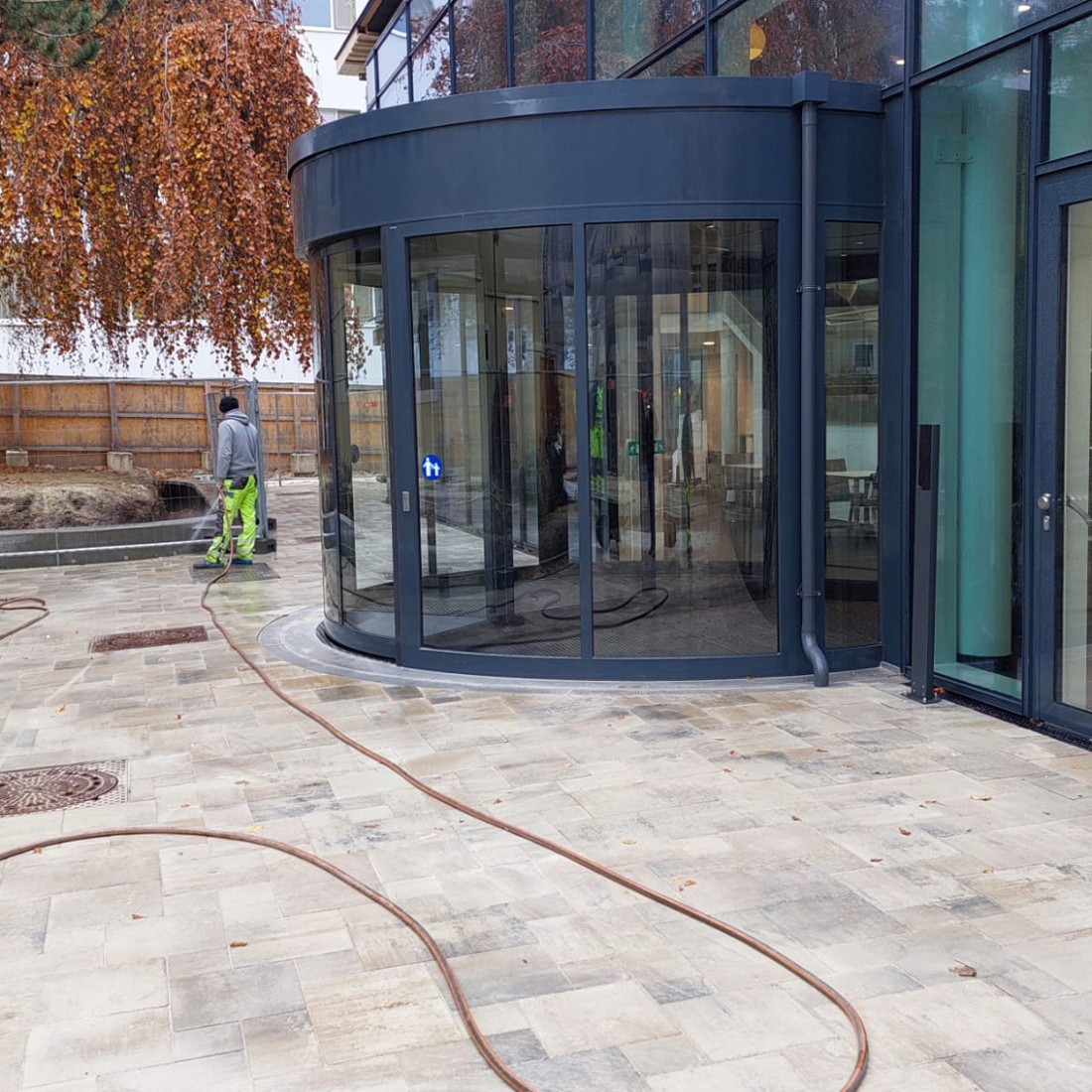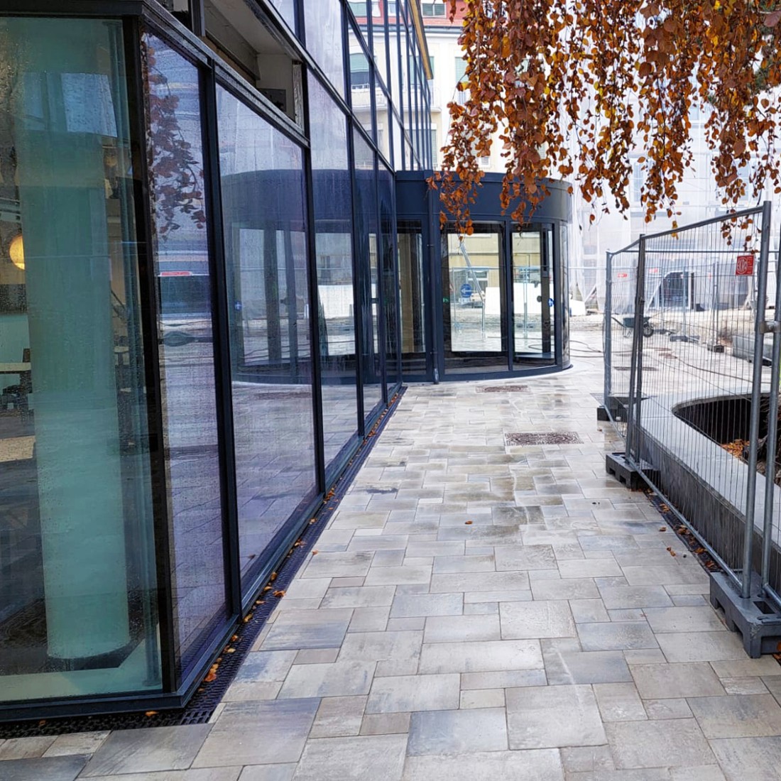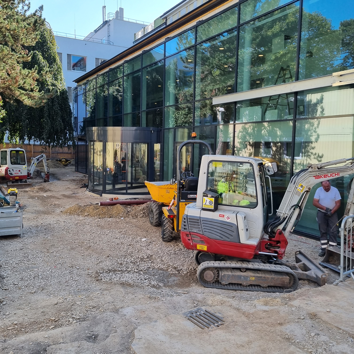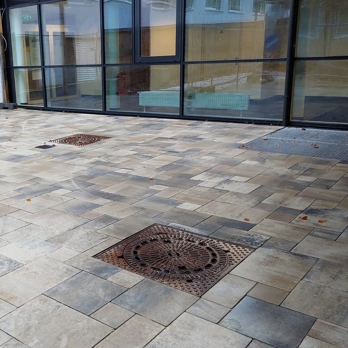 Wien, St. Josef Krankenhaus: Seit September 2021 arbeiten wir hier im Außenbereich. Das 250 Quadratmeter große Areal vor dem Haupteingang wurde im November eröffnet und besticht durch sein Betonsteinpflaster in der Farbe Muschelkalk. Es wurde im römischen Verband verlegt, wie es von den Architekten gewünscht wurde.