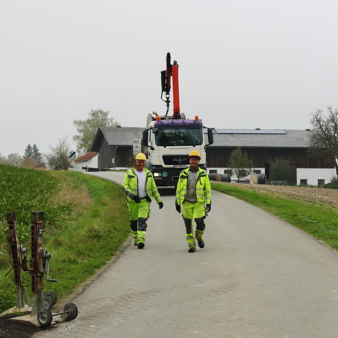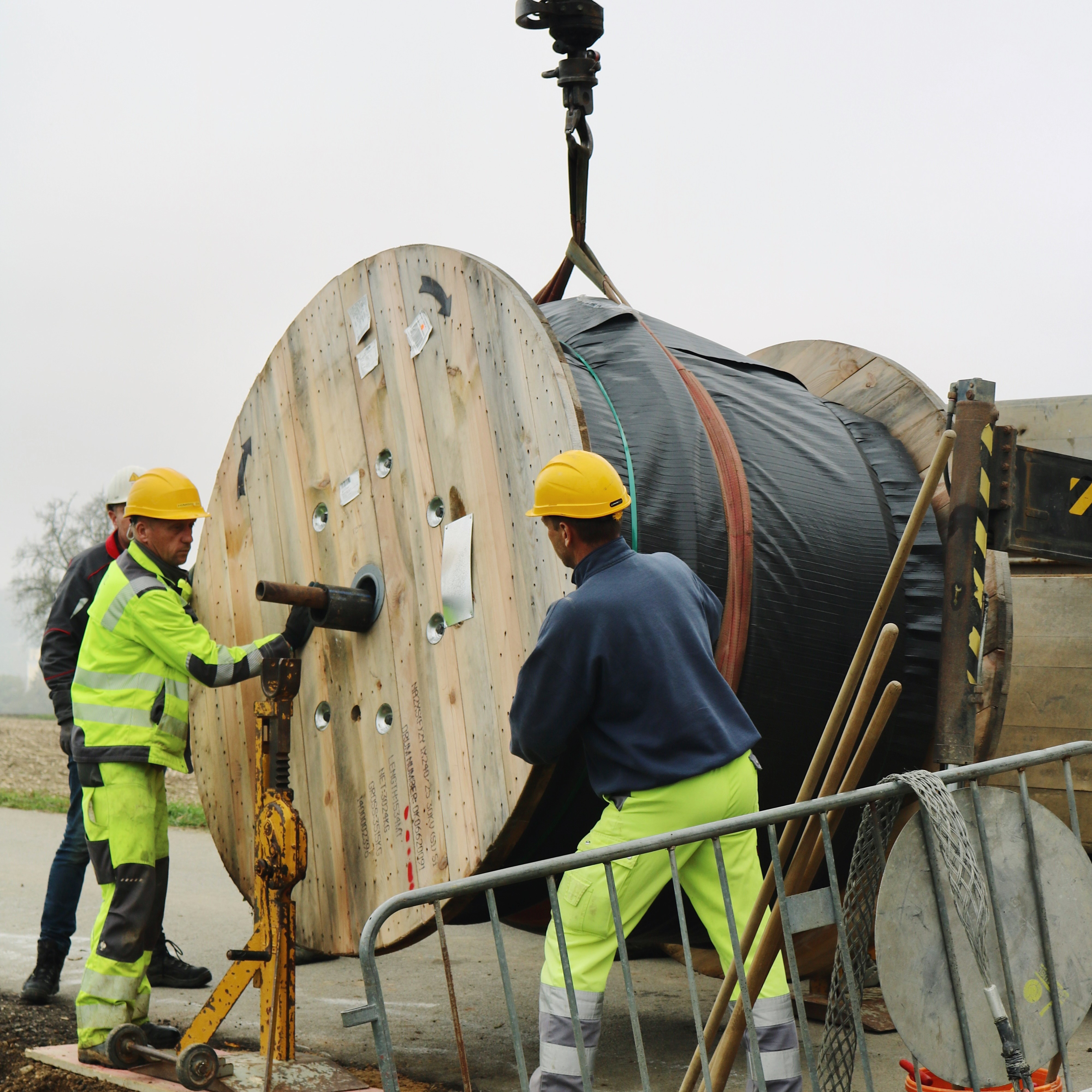 Immer wieder spektakulär anzusehen ist die Anlieferung und Platzierung der 30kv-Leitungen - hier im Bild zu sehen im Gemeindegebiet von Senftenbach. In Ried im Innkreis ist unser Team gerade mit der Verlegung der Stromleitungen und Leerverrohrungen beschäftigt.